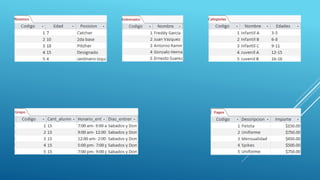 La liga infantil de béisbol contrató a una empresa para sistematizar su información. La liga se organiza en categorías por edad, cada categoría tiene grupos. Los grupos pertenecen a una categoría y son entrenados por un profesor. Los alumnos se inscriben en un grupo y los pagos son realizados por alumnos. Se debe diseñar una base de datos en Access para almacenar esta información sobre categorías, grupos, profesores, alumnos y pagos.