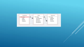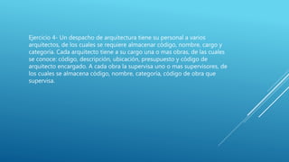 El documento describe un despacho de arquitectura que almacena información sobre sus arquitectos, obras y supervisores. Los arquitectos tienen código, nombre, cargo y categoría asignados. Las obras tienen código, descripción, ubicación, presupuesto y el código del arquitecto a cargo. Los supervisores tienen código, nombre, categoría y el código de la obra que supervisan.