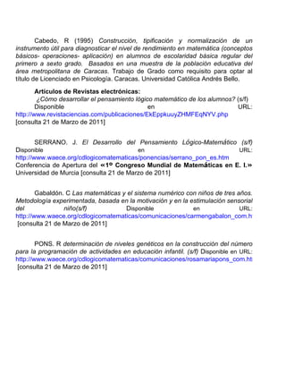 Este documento contiene una recopilación de materiales y fuentes bibliográficas relacionadas con el desarrollo del pensamiento lógico-matemático en niños. Incluye libros, tesis, artículos de revistas y ponencias académicas que abordan temas como la representación del mundo en niños según Piaget, el juego y su relación con procesos lógicos y matemáticos, y la adquisición de números y operaciones en la etapa preescolar.