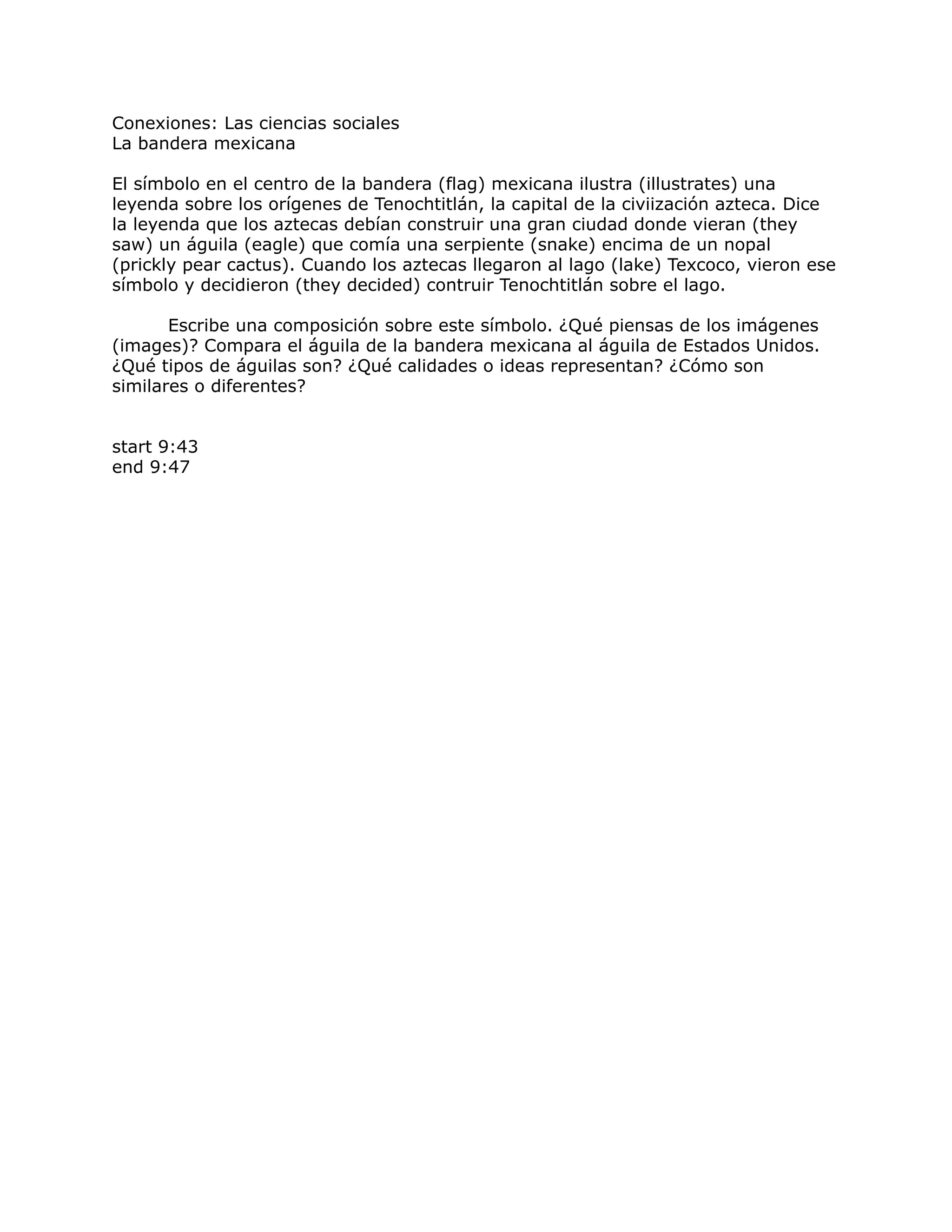 El documento describe la leyenda detrás del símbolo central de la bandera mexicana, que representa un águila parada sobre un nopal devorando una serpiente, el cual los aztecas vieron como una señal para fundar su ciudad capital de Tenochtitlán. Se pide escribir una composición comparando el águila mexicana con el águila estadounidense y discutiendo lo que representan.