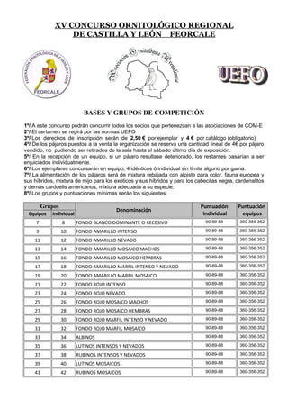 Este documento establece las bases y grupos de competición para el XV Concurso Ornitológico Regional de Castilla y León. Se dividen los pájaros en 192 grupos según su colorido y patrón, y se especifican las puntuaciones mínimas requeridas tanto para equipos de 4 pájaros idénticos como para pájaros individuales dentro de cada grupo.