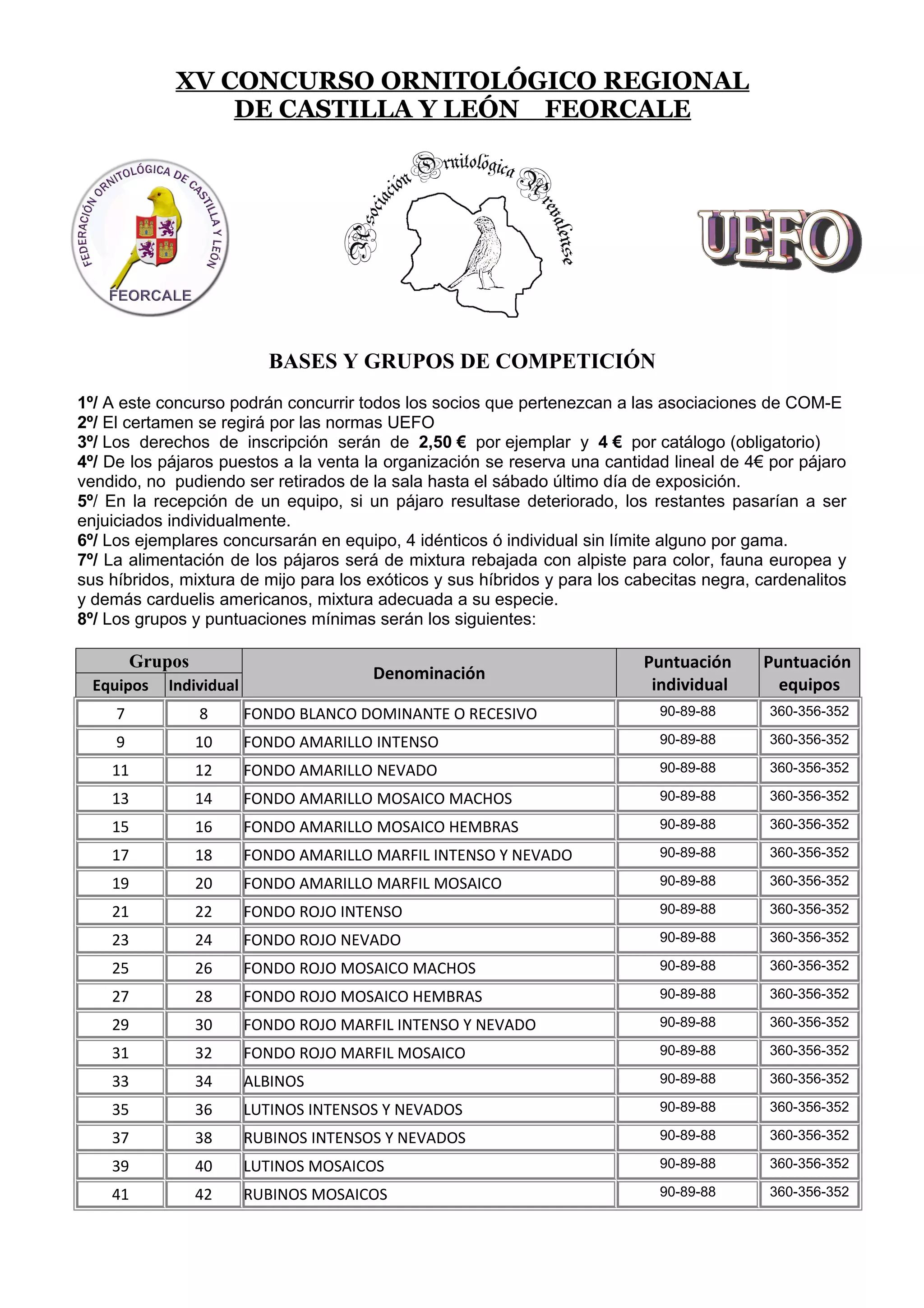 Este documento establece las bases y grupos de competición para el XV Concurso Ornitológico Regional de Castilla y León. Se dividen los pájaros en 192 grupos según su colorido y patrón, y se especifican las puntuaciones mínimas requeridas tanto para competir individualmente como en equipos de 4 pájaros idénticos.