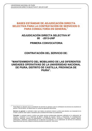 Este documento presenta las bases para la adjudicación directa selectiva del servicio de mantenimiento del mobiliario de las unidades operativas de la Universidad Nacional de Piura. Describe las etapas del proceso de selección, incluyendo la convocatoria, registro de participantes, formulación de consultas y observaciones, integración de las bases, y forma de presentación de propuestas. El objetivo es contratar a una empresa para realizar el mantenimiento del mobiliario de la universidad de acuerdo con la normativa peruana de contrataciones del estado.