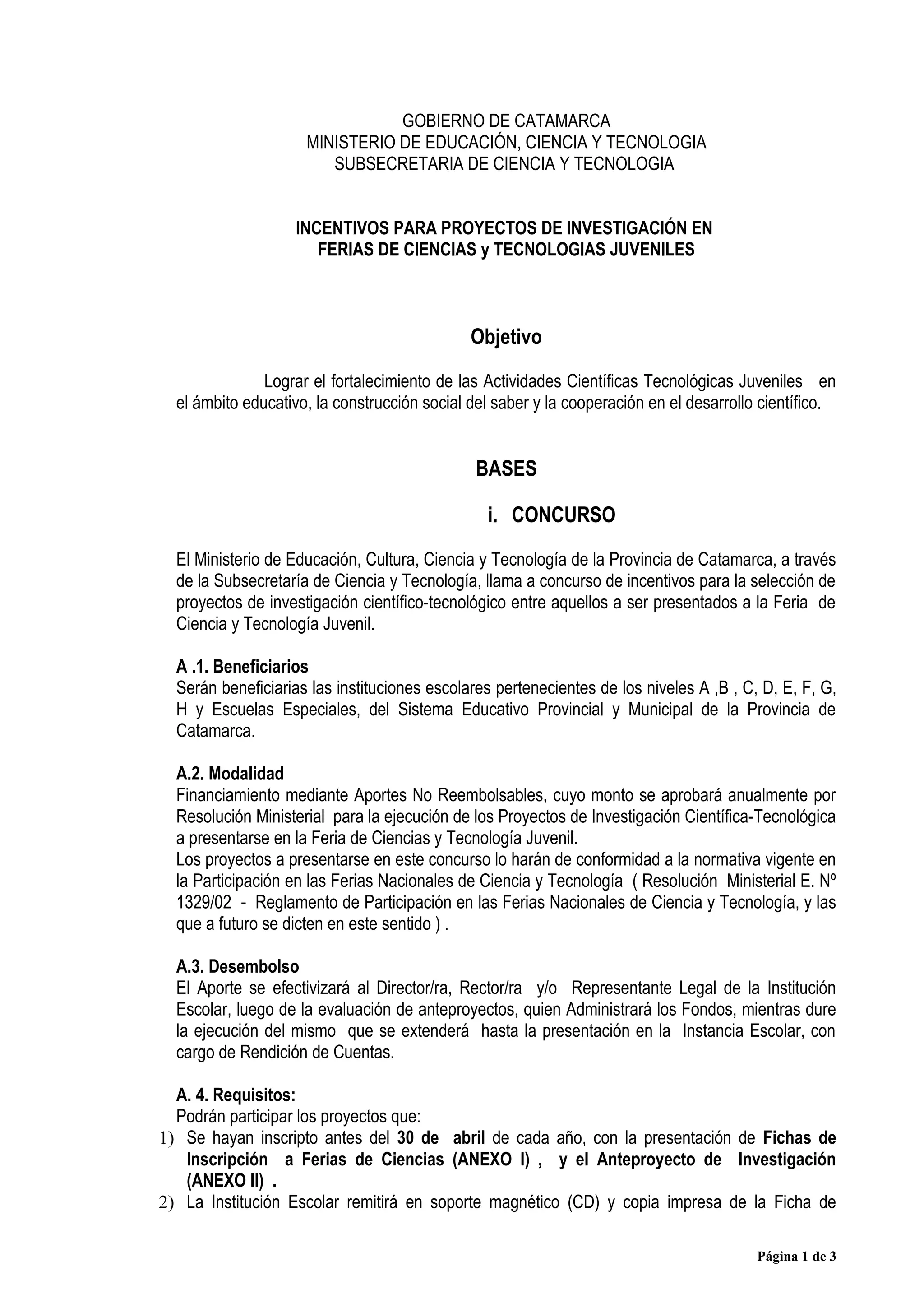 El documento describe los incentivos y premios para proyectos de investigación presentados en ferias de ciencias y tecnología juveniles en Catamarca. Establece que las instituciones educativas pueden recibir fondos para proyectos que se presenten en la feria provincial siguiendo ciertos requisitos. También detalla premios que se otorgarán a los mejores proyectos en cada nivel educativo y área temática. El objetivo es fomentar las actividades científicas y tecnológicas de los jóvenes.