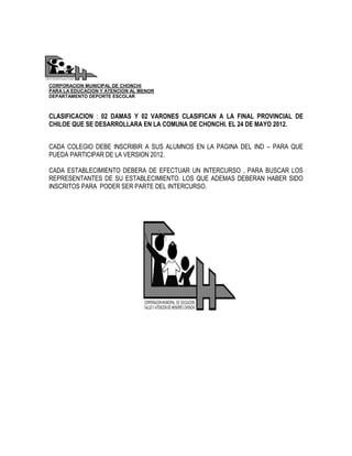 Este documento presenta las bases para un torneo escolar de ajedrez en la comuna de Chonchi, Chile en 2012. El torneo se llevará a cabo el 25 de abril en la biblioteca del Colegio San Carlos y está auspiciado por la Corporación Municipal de Educación. Habrá dos categorías, una para estudiantes nacidos entre 1998-1999 y otra para la enseñanza media entre 1996-1997. Cada escuela puede enviar dos damas y dos varones y los ganadores clasificarán a la final provincial de Chiloé el 24 de mayo de 2012.