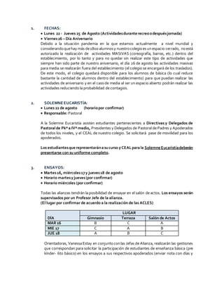 Este documento presenta los planes para las actividades del aniversario del Colegio María Inmaculada en 2022. Se dividirá a los estudiantes en tres alianzas (Egipcia, Greco-Romana y Nórdica) que competirán por puntos a través de actividades deportivas, religiosas y de recreación del 22 al 26 de agosto. Se describen los roles y responsabilidades de los líderes de cada alianza, las normas de conducta, y el sistema de puntos y descuentos. El objetivo es conmemorar el aniversario de una man
