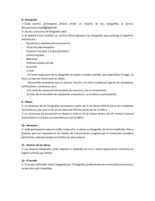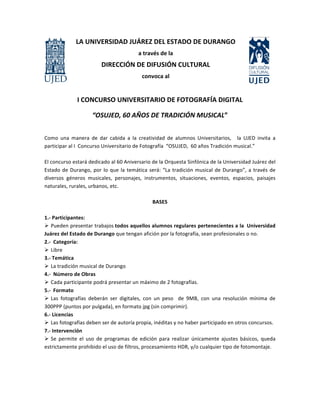 La Universidad Juárez del Estado de Durango convoca al I Concurso Universitario de Fotografía Digital "OSUJED, 60 Años de Tradición Musical" para estudiantes de la universidad. El concurso busca fotografías relacionadas con la tradición musical de Durango. Los estudiantes pueden enviar hasta dos fotografías digitales antes del 21 de marzo y los ganadores serán anunciados el 28 de marzo.