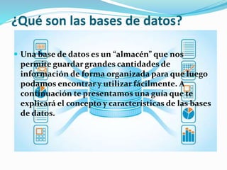 Este documento describe diferentes tipos de bases de datos, incluyendo bases de datos relacionales SQL, no SQL, y algunas de las bases de datos más populares como Oracle, Microsoft SQL Server, MongoDB, Oracle NoSQL, y Apache Cassandra. Explica que una base de datos es un almacén para organizar y almacenar grandes cantidades de información de forma que sea fácil de encontrar y usar, y proporciona detalles sobre las características clave de bases de datos relacionales y no SQL.