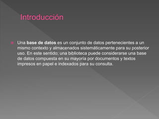 Una base de datos es un conjunto de datos almacenados sistemáticamente para su uso futuro. Actualmente, la mayoría de las bases de datos están en formato digital debido al desarrollo tecnológico. Las bases de datos pueden ser estáticas o dinámicas, y contener información bibliográfica, de texto completo, directorios o especializada.