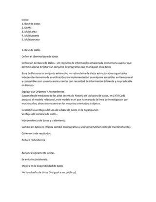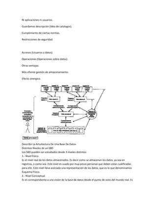 Este documento describe los conceptos básicos de las bases de datos. En primer lugar, define una base de datos y explica sus orígenes y ventajas. Luego, describe la arquitectura de una base de datos, incluidos los diferentes niveles y estructuras de bases de datos. Finalmente, clasifica los tipos de bases de datos según su uso y aplicación.