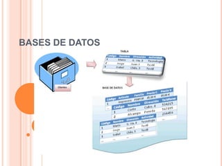 Una base de datos es una colección organizada de información que permite almacenar y recuperar datos de forma rápida y eficiente. Una base de datos contiene tablas, registros, campos y atributos que permiten organizar y relacionar la información de manera estructurada. Existen diferentes tipos de bases de datos como jerárquicas, en red y relacionales.