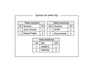 Este documento define conceptos básicos sobre bases de datos. Explica que una base de datos es un almacén de información organizada que permite guardar y acceder fácilmente a grandes cantidades de datos. Luego describe que una base de datos se compone de tablas con filas y columnas para almacenar los datos de forma estructurada y relacionada. Finalmente, define una base de datos como una serie de datos organizados y relacionados entre sí que son recolectados y explotados por los sistemas de información de una empresa.