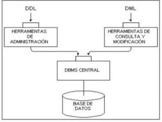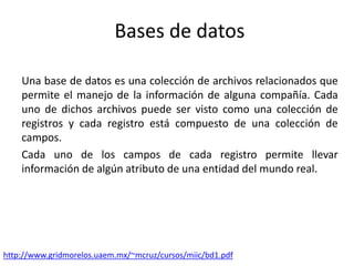 Este documento trata sobre las bases de datos. Explica que una base de datos es una colección de archivos relacionados que permite el manejo de la información de una compañía. Detalla que entre la base de datos física y los usuarios existe un software llamado sistema manejador de base de datos que maneja todos los requerimientos de acceso a la base de datos. Además, describe algunas de las ventajas de utilizar una base de datos como organizar y manipular grandes volúmenes de datos de forma compacta y actualizada.