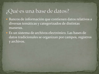 Este documento describe varios tipos de bases de datos, incluyendo bases de datos relacionales como SQL Server y Oracle, y bases de datos NoSQL como MongoDB, Oracle NoSQL, y Cassandra. Explica que las bases de datos almacenan datos de manera estructurada y categorizada, y que SQL y lenguajes similares permiten consultar y administrar los datos almacenados.