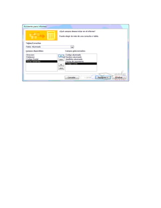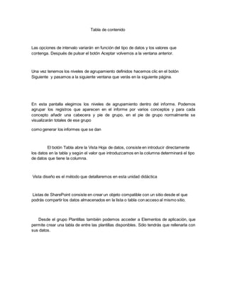 Este documento describe las características básicas de las bases de datos en Access 2010, incluyendo tablas para almacenar datos, consultas para seleccionar y actualizar datos, formularios e informes para presentar datos, y vistas de diseño para definir campos. Explica cómo crear agrupaciones en informes y define los intervalos de agrupamiento según el tipo de datos.