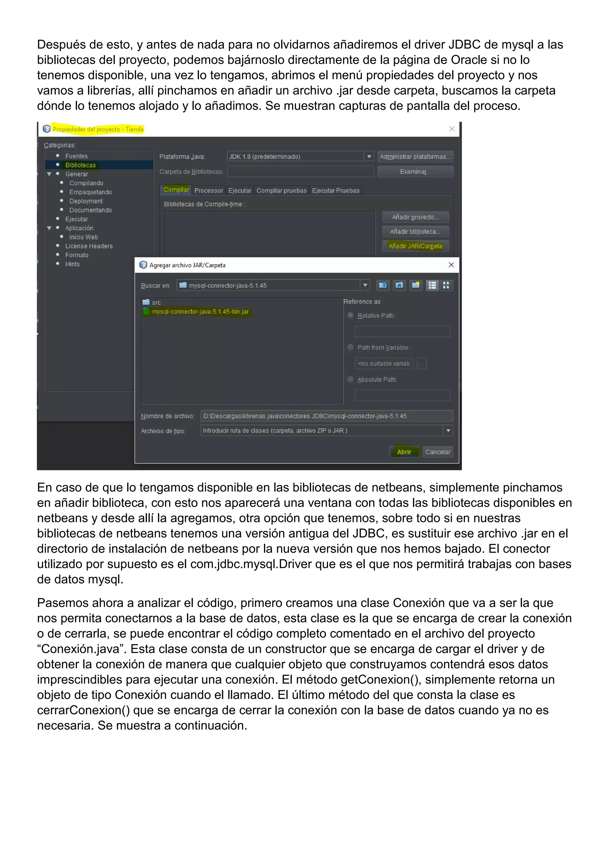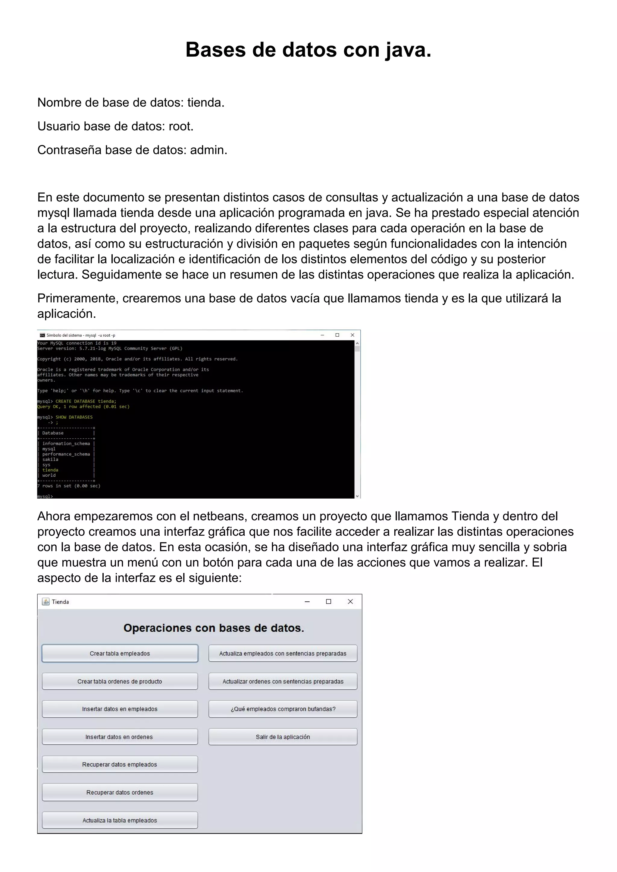 El documento describe cómo realizar consultas y actualizaciones en una base de datos MySQL llamada 'tienda' desde una aplicación Java. Se detalla la estructura del proyecto, que incluye clases para diferentes operaciones y una interfaz gráfica para facilitar el acceso a estas funciones. Además, se proporciona información sobre la conexión a la base de datos y las diversas clases que realizan operaciones específicas como crear tablas, insertar y recuperar datos.