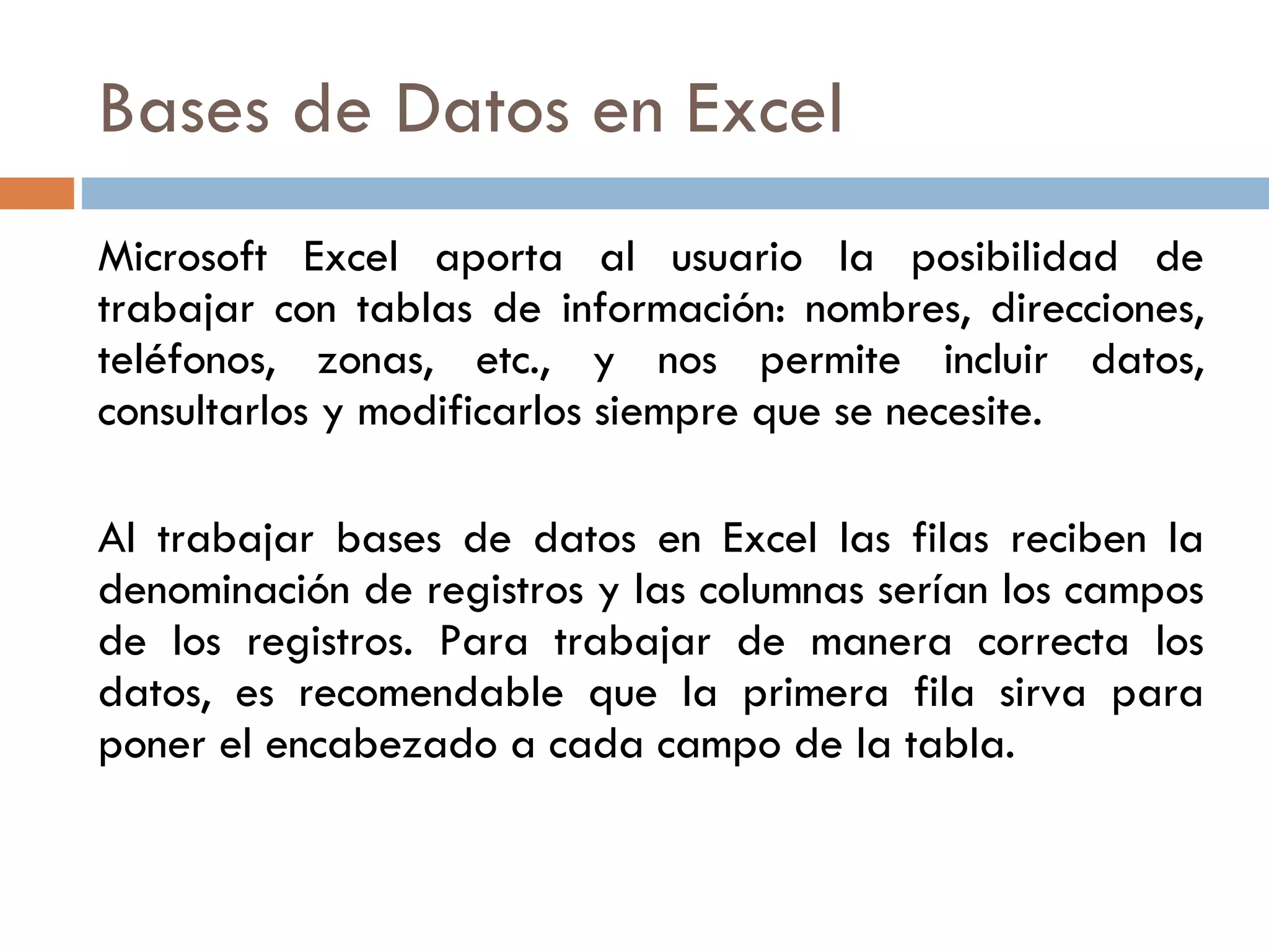 El documento explica el uso de bases de datos en Excel. Excel permite crear tablas con filas (registros) y columnas (campos) para almacenar y organizar datos. Aunque su capacidad es menor que Access, Excel puede usarse para bases de datos sencillas. Se describen conceptos como registros, campos, listas y tablas. También se explican operaciones como ordenar y filtrar registros. Por último, se propone un ejercicio para crear y manipular una base de datos de ventas.