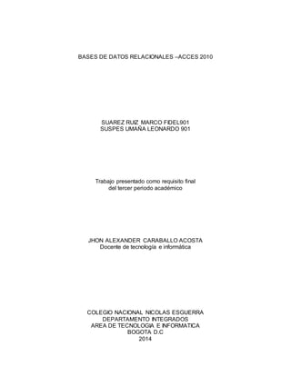Este documento describe cómo crear y utilizar una base de datos relacional en Microsoft Access 2010. Explica conceptos básicos como tablas de datos, formularios, informes y consultas. Detalla cómo crear una base de datos para una empresa deportiva ficticia llamada S & S Sporting Goods con tablas de empleados y productos.