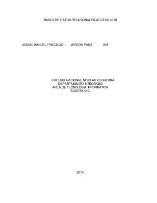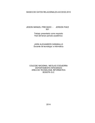 Este documento presenta un resumen de un proyecto sobre bases de datos relacionales en Microsoft Access 2010 realizado por dos estudiantes del Colegio Nacional Nicolás Esguerra. El proyecto incluye la creación de tablas, formularios e informes para almacenar y visualizar datos de empleados, activos y productos, así como el uso de relaciones entre las tablas.