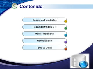Este documento resume los conceptos clave de las bases de datos relacionales, incluyendo llaves primarias, llaves foráneas, tablas, registros y campos. Explica las reglas para crear un modelo entidad-relación y convertirlo a un modelo relacional mediante tablas. También cubre los conceptos de normalización y los diferentes tipos de datos que se pueden utilizar en las bases de datos relacionales.