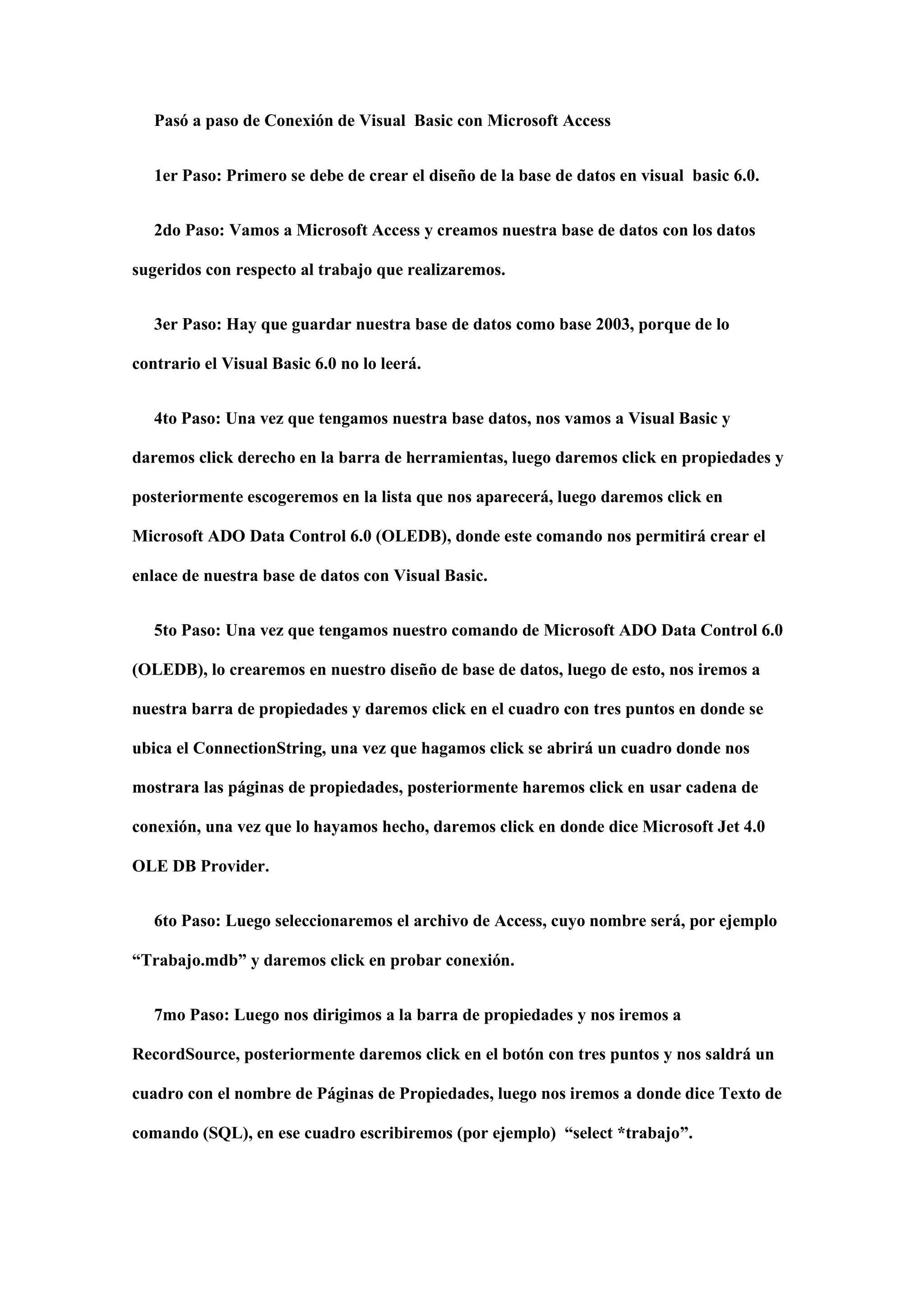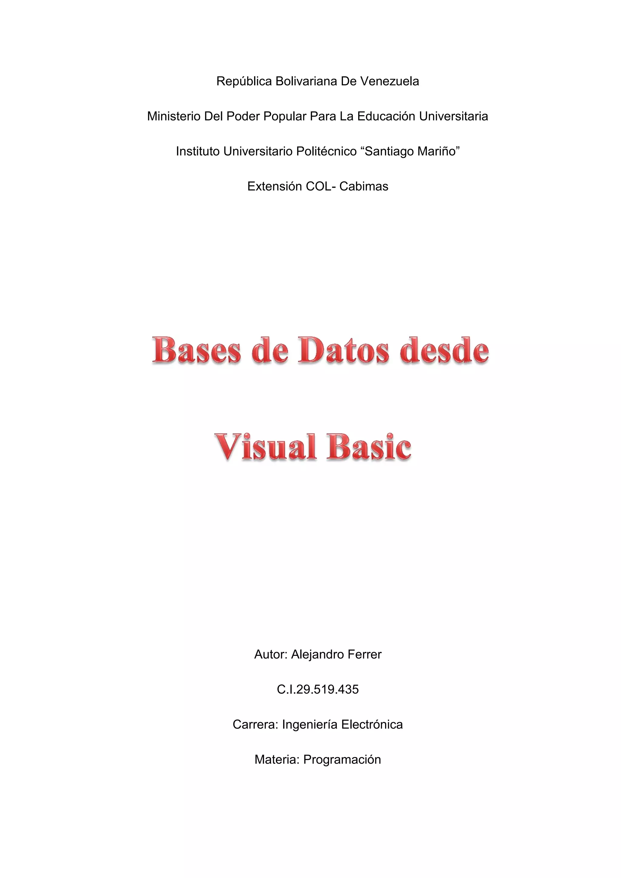 El documento describe los pasos para conectar Visual Basic con diferentes bases de datos. Para Microsoft Access, los pasos incluyen crear la base de datos en Access, guardarla en formato 2003, agregar el control de datos ADO en Visual Basic y establecer las propiedades como el archivo de conexión y las fuentes de datos. Para Microsoft SQL Server, los pasos son agregar referencias, crear objetos de conexión y registro, abrir la base de datos y asignar nombres de campos. Para MySQL, los pasos son descargar el conector .NET, importar bibliotecas, declarar