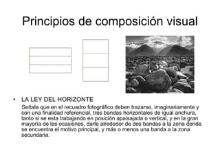 El documento describe los principios básicos de la composición visual en fotografía y pintura, incluyendo las leyes del horizonte, la mirada y los tercios, así como los elementos que constituyen una imagen como la figura, perspectiva, volumen, textura, tono e iluminación. También explica los siete planos del encuadre fotográfico como el plano general, de conjunto, de cuerpo entero, entre otros.