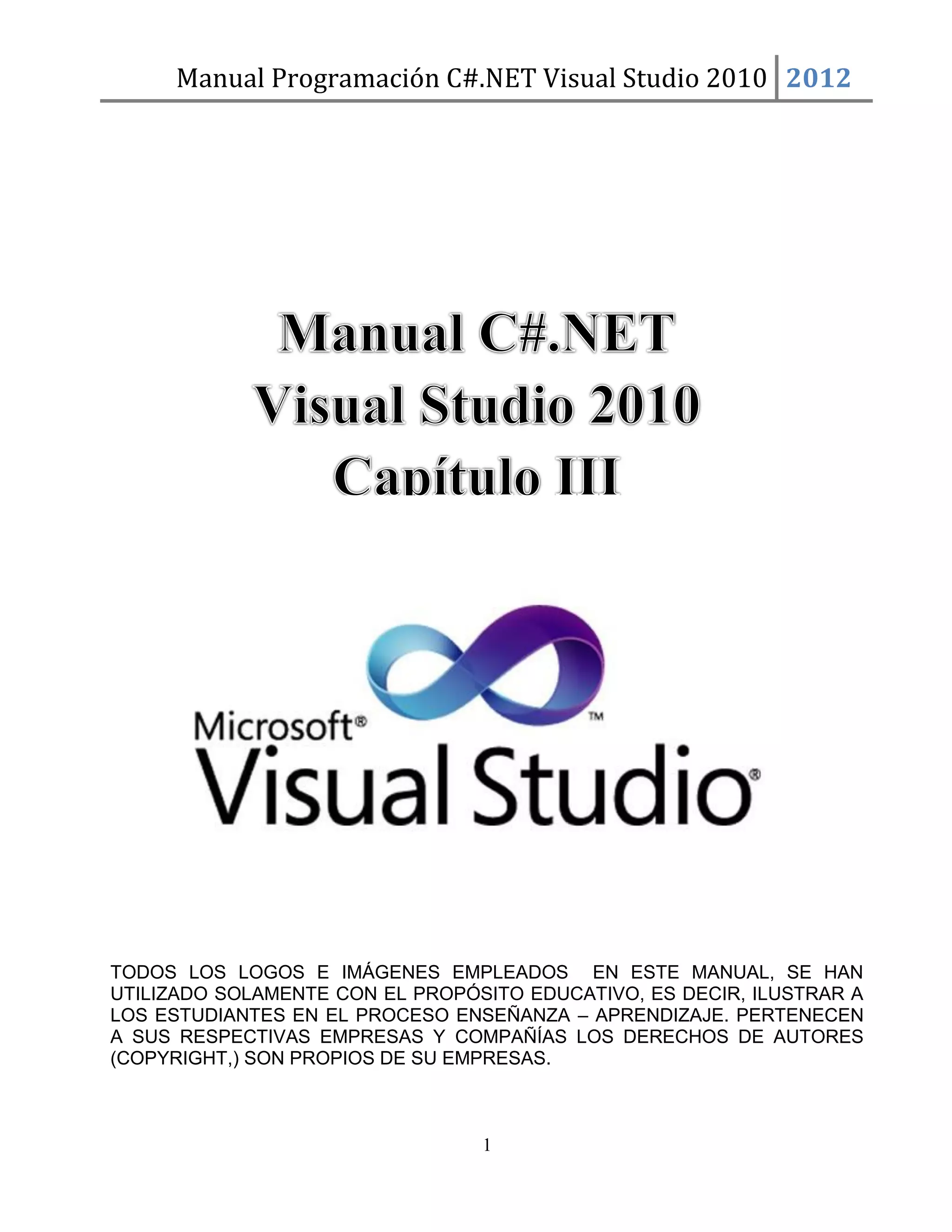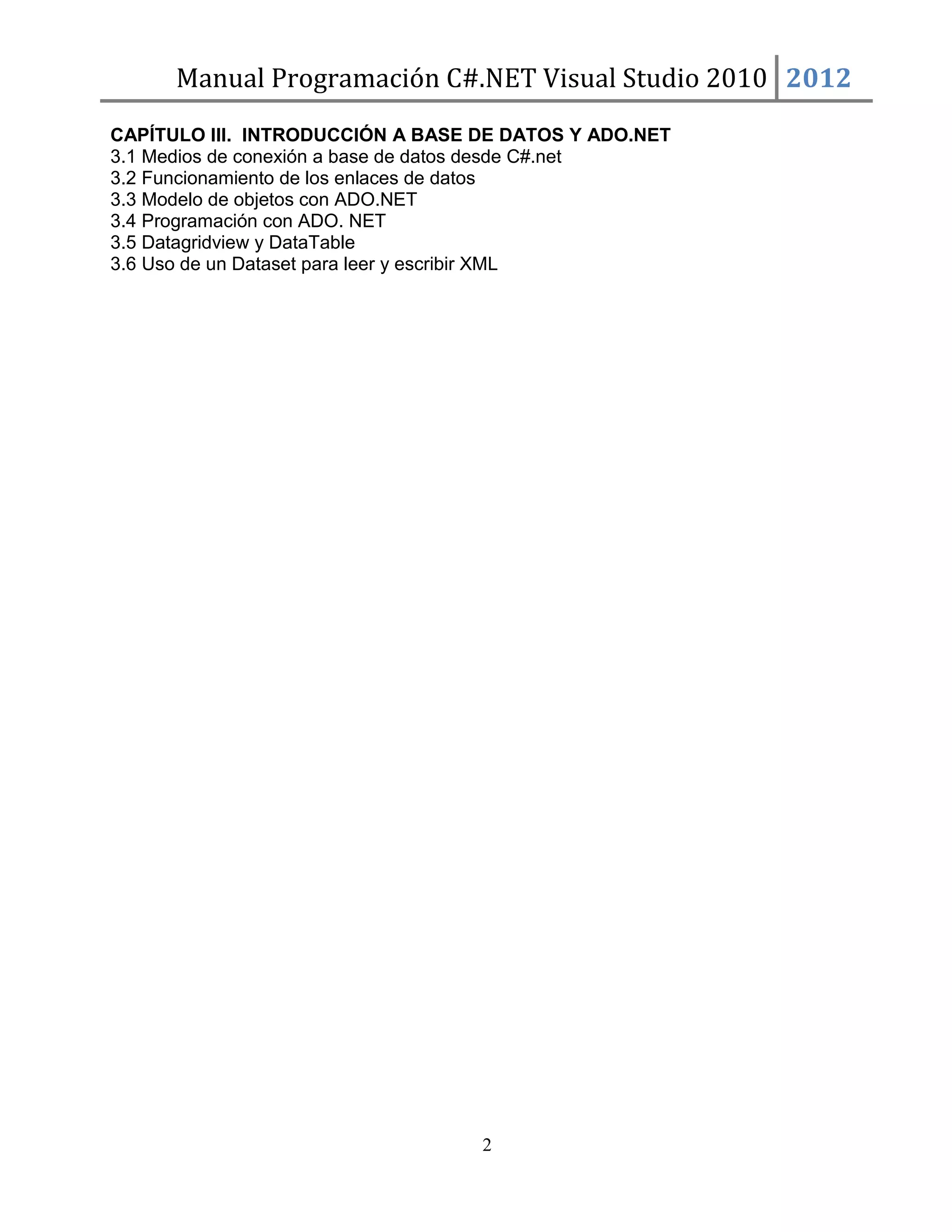 Este manual describe cómo programar aplicaciones en C# .NET usando Visual Studio 2010/2012. Explica conceptos como la conexión a bases de datos con ADO.NET, el uso de datasets y datagridviews, y la sincronización de datos con Microsoft Sync Framework. También cubre temas como el modelado de objetos con ADO.NET y la programación con conjuntos de datos sin conexión.