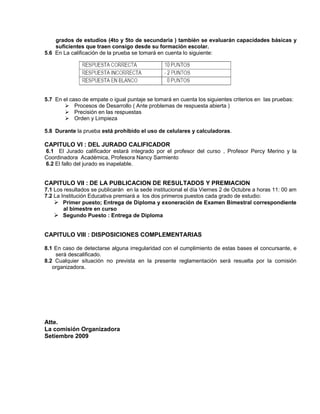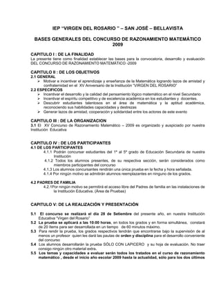Este documento establece las bases para un concurso de razonamiento matemático organizado por la Institución Educativa "VIRGEN DEL ROSARIO" en el 2009. El concurso tiene como objetivos motivar el aprendizaje de las matemáticas y descubrir talentos estudiantiles. Se llevará a cabo el 28 de septiembre para estudiantes de primero a quinto grado de secundaria. Los estudiantes tendrán 60 minutos para responder una prueba de 20 ítems que será calificada por un jurado. Los ganadores recibirán diplomas y