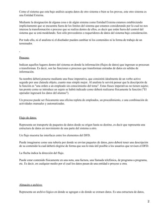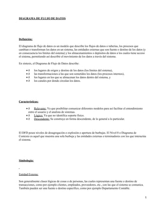 El diagrama de flujo de datos describe los flujos de datos y procesos en un sistema, incluidos los orígenes y destinos de datos externos, las transformaciones de datos, los almacenamientos de datos y los canales por los que circulan los datos. Se usa para modelar el movimiento lógico de datos a través de un sistema sin considerar aspectos físicos. Se compone de procesos, flujos de datos, almacenes y entidades externas.