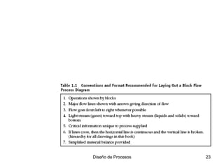 Este documento presenta información básica sobre el diseño de procesos para una materia impartida en la carrera de Ingeniería en Industrias Agropecuarias. Incluye los objetivos y competencias de la materia, el índice de contenidos, y detalles sobre el profesor y horarios. También introduce conceptos clave como diagramas de flujo, análisis económico, optimización de procesos y selección de equipos.