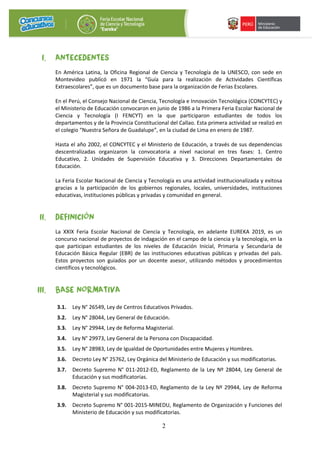 Este documento establece las bases para la realización de la XXIX Feria Escolar Nacional de Ciencia y Tecnología (EUREKA 2019) en Perú. Define los objetivos, participantes, categorías y áreas de participación. Los estudiantes de educación inicial, primaria y secundaria presentarán proyectos de indagación científica y tecnológica guiados por docentes. El evento busca promover las competencias científicas de los estudiantes y fomentar el interés por la ciencia.