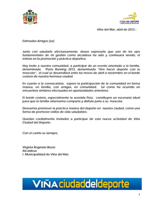 La Ilustre Municipalidad de Viña del Mar, a través de la Casa del Deporte, ha organizado el evento "Perro Running 2012" que consiste en una serie de carreras de 1.4 km en el borde costero de la ciudad entre abril y noviembre, con el objetivo de promover estilos de vida saludables a través de la práctica del deporte en familia y con mascotas. El evento es gratuito y abierto a personas de todas las edades con sus perros, y ofrece premios a los ganadores de cada fecha.