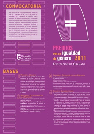 Este documento describe la convocatoria de los Premios por la Igualdad de Género 2011 de la Diputación de Granada. Los premios reconocen el trabajo realizado en la provincia de Granada para promover la igualdad y se dividen en cuatro categorías. Cada premio incluye una distinción simbólica, reconocimiento público y 2,500 euros. El documento establece los criterios y proceso de nominación, evaluación por un jurado y entrega de los premios.