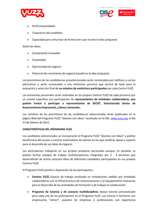 El programa YUZZ tiene como objetivo promover el talento y espíritu emprendedor de jóvenes entre 18 y 30 años. Ofrece apoyo, formación y asesoramiento a los seleccionados para desarrollar proyectos de negocio basados en sus ideas innovadoras. Los participantes recibirán tutoría, acceso a centros de emprendimiento y una red de expertos. Al final del programa se otorgan premios a los mejores proyectos a nivel local, provincial y nacional.