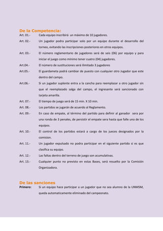 Este documento presenta las bases del Campeonato Relámpago de Fulbito Varones Verano 2011. Participarán alumnos de la UNMSM debidamente identificados. Los equipos estarán formados por hasta 10 jugadores cada uno y deberán inscribirse en la oficina de Bienestar, pagando S/. 20.00 de inscripción. La competencia consistirá en partidos de 15 minutos divididos en dos tiempos de 10 minutos cada uno.