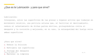 El documento aborda la lubricación, explicando su función principal de reducir fricción y proteger componentes mecánicos mediante el uso de lubricantes que consisten en aceites base y aditivos. Describe las características clave de los lubricantes, como densidad, viscosidad e índices de temperatura, además de detallar las gamas de lubricantes y grasas de la marca Shell. Se enfatiza la importancia de los aditivos en la mejora de la eficiencia y protección de los sistemas lubricados.