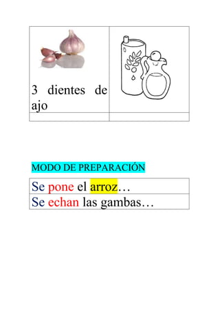 Este documento contiene una receta para preparar mejillones que incluye ingredientes como mejillones, azafrán y ajo. La receta describe los pasos de cocinar el arroz y agregar gambas antes de servir. También incluye ejemplos de diálogos en un restaurante sobre pedir comida y quejas.