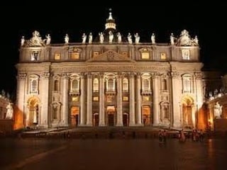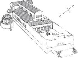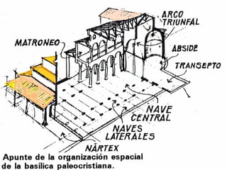 El documento describe la cronología de la transición de la religión pagana a la religión cristiana en el Imperio Romano, destacando el Edicto de Milán de 323 d.C. emitido por el emperador Constantino que legalizó el cristianismo. También menciona elementos arquitectónicos clave de una basílica cristiana como la Basílica de San Pedro en el Vaticano.