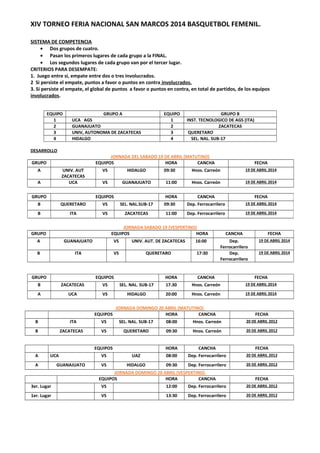 El documento describe el sistema de competencia y el calendario del Torneo Feria Nacional San Marcos 2014 de basquetbol femenil. El torneo contará con dos grupos de cuatro equipos cada uno. Los primeros lugares de cada grupo avanzarán a la final mientras que los segundos lugares jugarán por el tercer puesto. El documento incluye el calendario con los partidos programados para cada jornada del sábado y domingo.