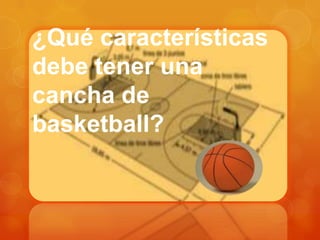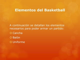 El documento detalla los elementos necesarios para jugar un partido de basketball, incluyendo la cancha, el balón y el uniforme. Describe que la cancha debe medir 15 metros de ancho y 28 metros de largo, con una línea central y círculos en cada extremo para las canastas de 3.05 metros de altura. Explica también que el balón debe ser esférico y de cuero o material sintético para un agarre fácil, y que el uniforme consiste en una camiseta sin mangas, pantalón corto o bermuda