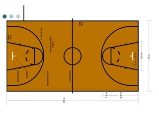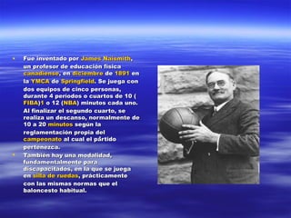 El baloncesto, inventado por James Naismith en 1891, es un deporte de equipo que se juega con dos equipos de cinco jugadores, tratando de introducir un balón en un aro a 3 metros de altura. Existen reglas específicas sobre cómo jugar, los tipos de faltas, y la puntuación, que varían ligeramente según las competiciones. El deporte también tiene modalidad adaptada para personas con discapacidad, y los jugadores ocupan diferentes posiciones con roles y responsabilidades específicas dentro del equipo.