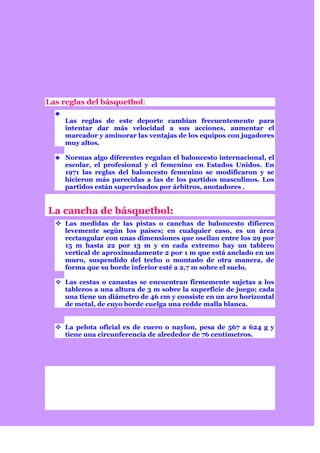 El básquetbol es un deporte que se juega entre dos equipos de cinco jugadores cada uno. El objetivo es anotar más puntos que el equipo contrario encestando el balón en la canasta contraria a través de pases y tiros. Los partidos constan de dos mitades de 20 minutos con un descanso en el medio. Se anotan dos puntos por canasta y un punto por tiro libre.