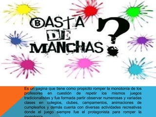 Este documento presenta el sitio web Basta de Manchas, creado por un profesor de educación física para ofrecer diversas actividades recreativas y juegos alternativos a los tradicionales, con el objetivo de romper la monotonía en clases, campamentos y otras actividades donde los niños suelen jugar. El sitio proporciona ideas para profesores, estudiantes y animadores buscando aprendizaje y diversión sin recurrir a los mismos juegos de siempre.