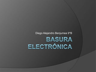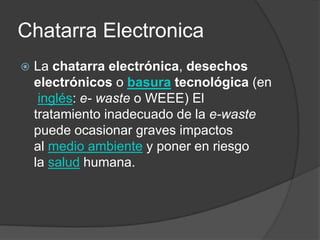 El documento habla sobre los problemas ambientales asociados con la chatarra electrónica. Explica que los desechos electrónicos contienen sustancias tóxicas como el mercurio, plomo y cadmio que son dañinas para la salud humana y el medio ambiente. También señala que el tratamiento inadecuado de estos desechos electrónicos contamina el suelo y el agua. Finalmente, propone algunas soluciones como reducir la generación de desechos, donar o reciclar equipos electrónicos, y promover que las
