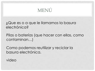 Este documento trata sobre la basura electrónica. Explica que la basura electrónica se refiere a los desechos provenientes de aparatos electrónicos y eléctricos obsoletos. Describe los peligros de la contaminación por pilas y baterías si no son desechadas adecuadamente. Finalmente, ofrece algunas opciones para reutilizar y reciclar la basura electrónica, como empresas de reciclaje, joyería que usa circuitos electrónicos, y reciclar artículos en el hogar.