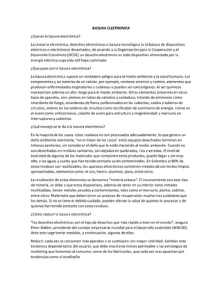 La basura electrónica se refiere a los dispositivos eléctricos y electrónicos desechados al final de su vida útil y contiene materiales tóxicos como el arsénico, cadmio y plomo que son dañinos para el medio ambiente y la salud humana. A menudo esta basura no se procesa adecuadamente y termina en vertederos o en la naturaleza, contaminando el agua y el suelo. Se debe fomentar la reducción, reutilización y reciclaje adecuado de estos desech