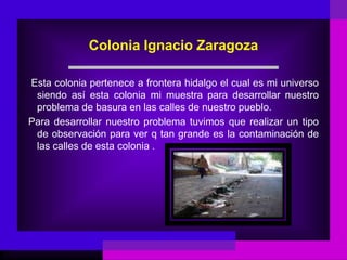 Este documento describe el problema de la basura en las calles de la colonia Ignacio Zaragoza en Frontera Hidalgo, México. Explica que la basura se acumula debido a que las personas tiran su basura inconscientemente. Detalla las consecuencias negativas de la basura acumulada como enfermedades, inundaciones e impactos ambientales. El documento propone como hipótesis incrementar grupos de limpieza formados por residentes para limpiar la basura dos veces por semana y resolver el problema.