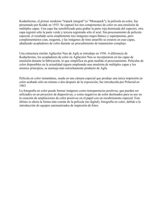 La fotografía en color se exploró a partir del siglo XIX, pero los primeros métodos requerían exposiciones largas y los colores se decoloraban rápido. En 1861 se tomó la primera foto de color permanente usando el principio de separación de tres colores propuesto por James Clerk Maxwell en 1855. Posteriormente se desarrollaron métodos para reproducir el color mediante proyección o impresión de las tres imágenes separadas. El proceso Autochrome de los hermanos Lumière en 1907 fue el primer éxito comercial usando una capa de fil