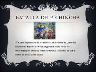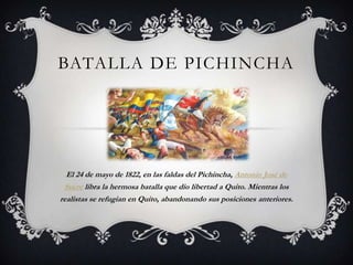 La Batalla de Pichincha ocurrió el 24 de mayo de 1822 en las faldas del volcán Pichincha en Ecuador, donde el general Antonio José de Sucre derrotó a las fuerzas realistas españolas que defendían Quito. Sucre ordenó atravesar Quito de noche para tomar una posición insólita y difícil de defender, lo que llevó a las fuerzas realistas a abandonar sus posiciones y refugiarse en Quito, dando así la libertad a la ciudad y avanzando la liberación de Ecuador del dominio español.