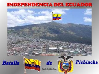 El documento describe la Batalla de Pichincha del 24 de mayo de 1822 en la que las tropas patriotas lideradas por el general Antonio José de Sucre derrotaron a las fuerzas realistas españolas y lograron la independencia de Quito y el sur de Colombia. Relata los preparativos de la batalla, incluyendo el movimiento sigiloso de las tropas patriotas hacia el volcán Pichincha la noche anterior. Describe el desarrollo de la batalla en las empinadas laderas del volcán y la victoria final de los patriotas.